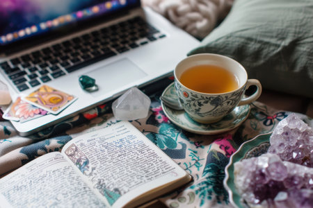 Mystical Flat Lay with Tea, Tarot Cards, and Horoscope Journal for Daily Reflection