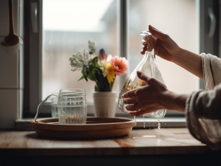 A person's hands pour refreshing water from a glass pitcher into a drinking glass on a warm, sunlit kitchen counter, surrounded by vibrant fresh fruits, emphasizing healthy hydration and a wholesome .