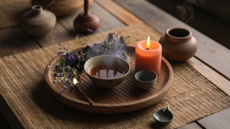 Relaxation still life featuring herbal tea candles crystals lavender and anise stars. Aromatherapy wellbeing concept. Comforting scene for relaxation and mindfulness. AI Generative AI generated