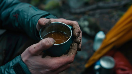 hands holding a cup with hot drink in the middle of a cold mountain generative ai