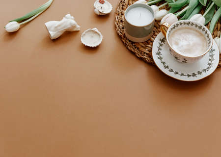 Easter, spring, 8 march, mother day, still life scene. White tulips and coffee cup on brown background, top view, flat lay, copy space