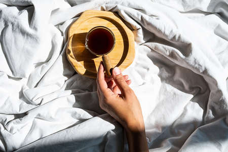 Females hand reaches for morning coffee cup in bed. Woman wakes up on white bedding in sunlight.