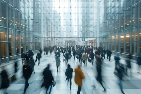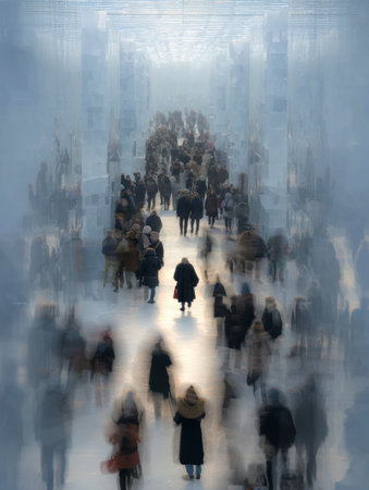 A bustling urban space filled with people walking purposefully under soft lighting, creating a dynamic atmosphere on a busy day in the city.