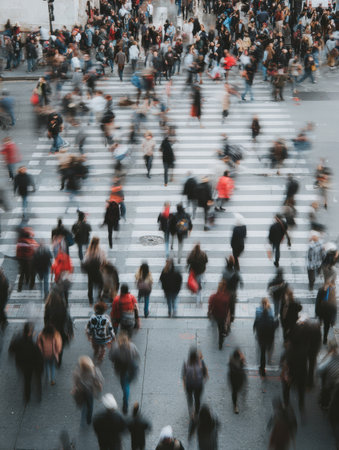 Crowds navigate a bustling city crosswalk, reflecting the energy of urban life during a busy time of day with people dressed in various styles.