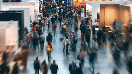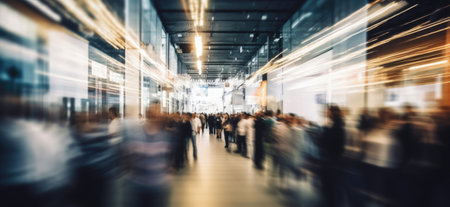 People are navigating a bustling convention hall with dynamic motion blur, creating a sense of activity and movement throughout the crowded trade show or public event