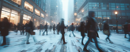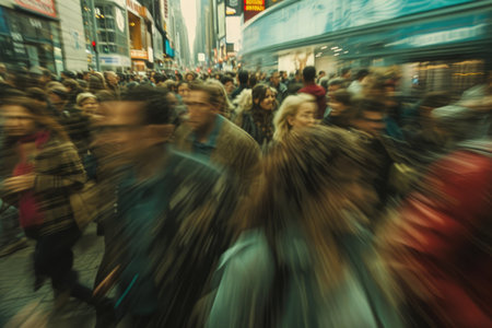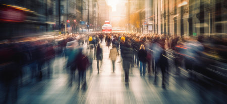 Many blurred people are quickly walking in different directions in a busy city business district during rush hour, creating a sense of urgency and stress