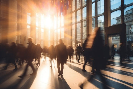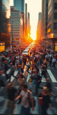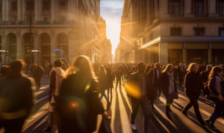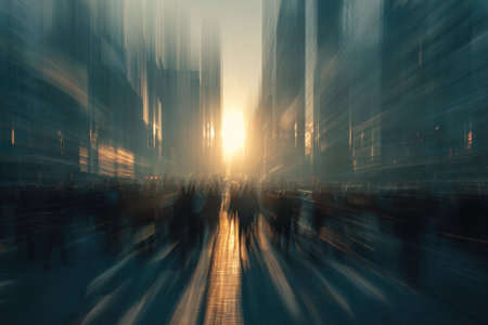 A captivating urban scene featuring blurred figures in a bustling business district during golden hour, enhancing the dynamic atmosphere and abstract beauty of city life.