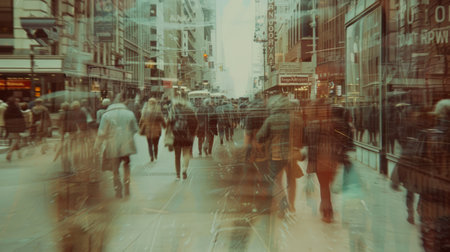 a crowd of anonymous blurred pedestrians walking along the sidewalk of a big city