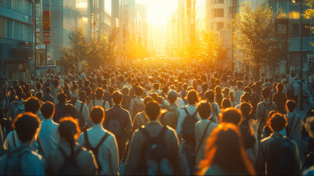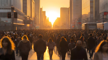 Crowd of people walking on wide city street with sunset at the background., City life, social issues concept