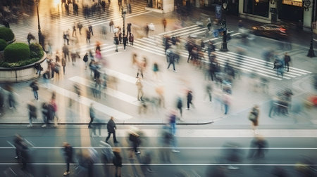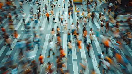 Aerial view of crowd people walks on a business street pedestrian in the city. blurred business people walking on a street. Generative Ai