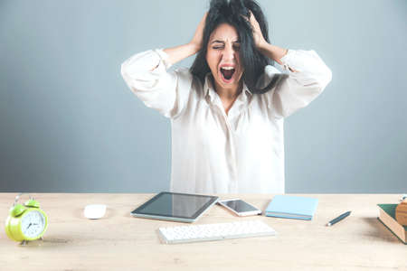 angry woman in office desk on gray background