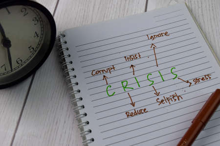 Crisis write on a book with keywords isolated on wooden background. Finance concept