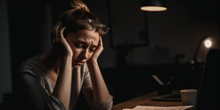 Young girl lost hope and holding her head, tired and upset unhappy freelancer after failure at work concept photo