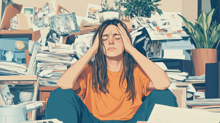 A young woman with curly hair and glasses holds her head in frustration while sitting in a room filled with vibrant notes and reminders on the walls, hinting at a busy life and stress.