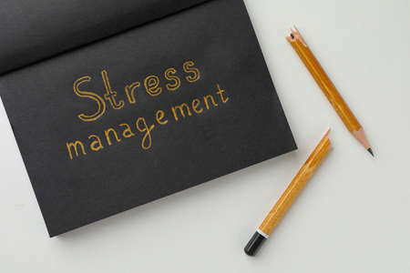 Black sketchbook with words Stress Management and broken pencil on white background, flat lay