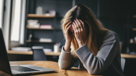 person holding his head with his hands, showing a painful expression, with modern office in the background generative ai