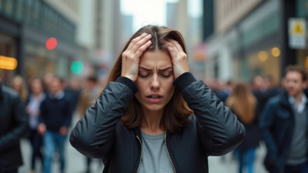 In this striking image, a woman clasps her head in her hands, overwhelmed by anxiety and stress on a bustling street in a big city. The noise and chaos of urban life contribute to her panic attack, highlighting the importance of mental health awareness in high-pressure environments.