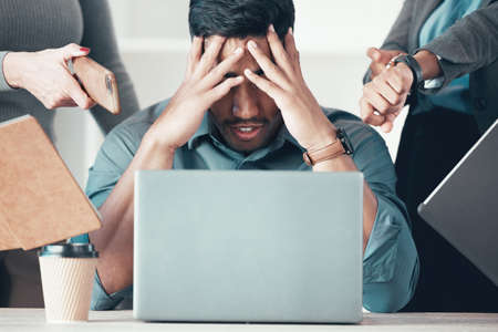 Theyre driving me crazy. Shot of an unrecognisable businessman sitting in the office and feeling stressed while his colleagues put pressure on him.