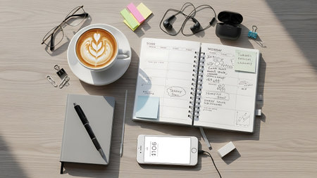 An organized workspace displays a planner, smartphone, clock, glasses, and decorative items. The composition features neutral tones with contrasting objects, captured from above with balanced lighting. Suitable for articles or websites related to productivity, time management or business planning. The scene suggests a modern office.