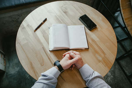 top view men's hands and diary lying on the table, businessman sitting at the table, round table Notepad phone pen man, thinking, concentration, planning