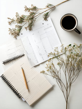 A clean workspace showcases a minimalist planner layout with open notebooks, a pencil, a coffee cup, and delicate dried flowers for an organized feel.