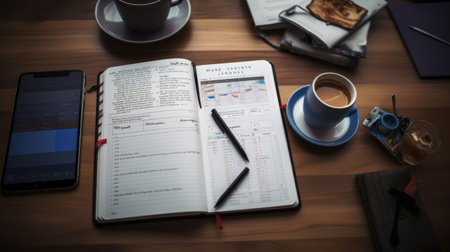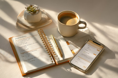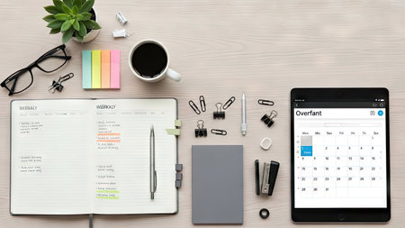 An organized workspace displays a planner, tablet, and various office supplies. The composition includes a coffee cup, stationery, and a small potted plant. The setting appears to be indoors with overhead lighting. Suitable for illustrations about planning, work, scheduling, or related commercial applications.