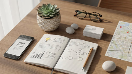 A wooden desk features a smartphone displaying a calendar app and an open notebook with diagrams. A succulent plant, glasses, and a stack of business cards are also present. The scene is illuminated by natural light, and a map provides context. This image could be useful in business, technology, or lifestyle content.
