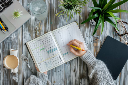 Persons hands writing notes and new goals in a personal planner or notebook on a wooden desk, reflecting on completed tasks with a cup of coffee nearby