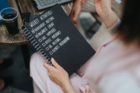 Close-up of a planner highlighting weekly tasks during a casual business meeting.