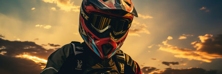 Close-up portrait of a motocross rider on sunset background