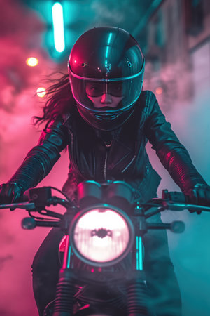 Motorcycle riders with neon helmets perform synchronized stunts creating a dazzling display of neon lights in motion. Concept Neon Helmets, Synchronized Stunts, Motorcycle Riders, Dazzling Lights