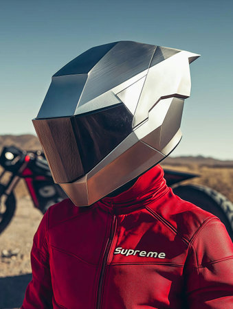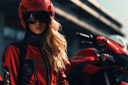 Young cool woman with long hair wearing motorcycle gear and helmet, AI Generated