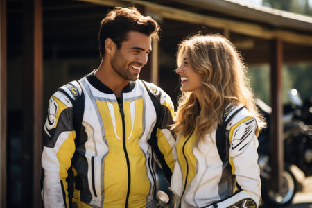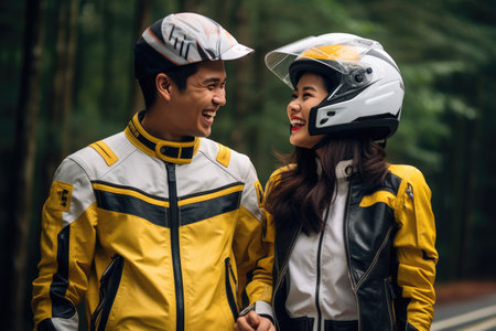 Young laughing couple wearing motorcycle gear and helmets, yellow and black colors, AI Generated