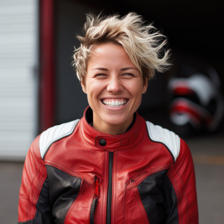 Young laughing woman with short hair wearing motorcycle gear and helmet, red and black colors, AI Generated