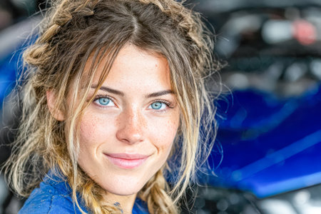 Smiling female mechanic with braided hair in a garage, showcasing tools and automotive equipment, exuding confidence and professionalism.