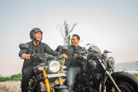 asian riders talking at each other while sitting on motorcycle