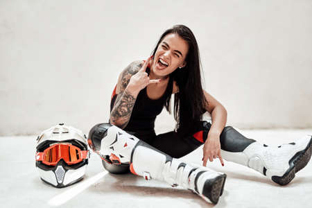 Funny smiling girl with tatoos in a black and red tracksuit, white boots and with a motorcycle helmet, posing in a white photo studio, sitting on the floor, sticking her tongue out