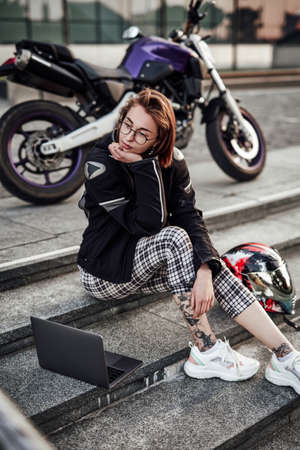 Elegant and beautiful young girl is sitting next to her purple motorcycle, working at the computer. She wears a motorcycle jacket, plaid pants and black-rimmed glasses