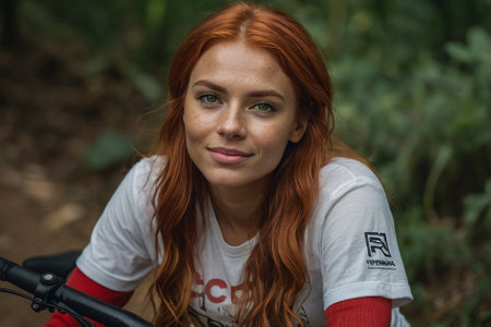 Portrait of a beautiful young woman with red hair on a mountain bike