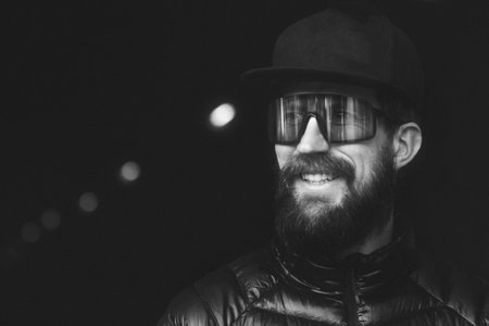 Young man with sports glasses in white and black on a dark background