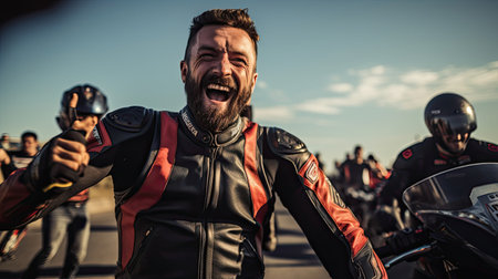 laughing man with long hair wearing motorcycle gear and helmet, red and black colors, AI Generated