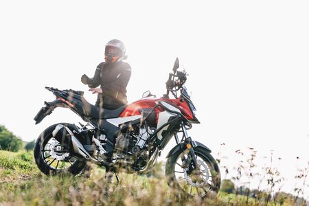 Woman preparing to drive a motorbike. Wearing gloves on a roadside