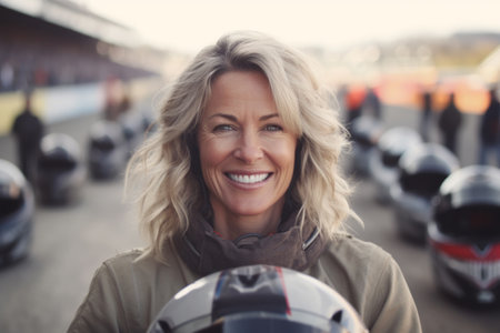 Portrait of a happy woman with a motorcycle helmet on the race track