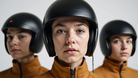 Students wearing sleek retro-futuristic helmets