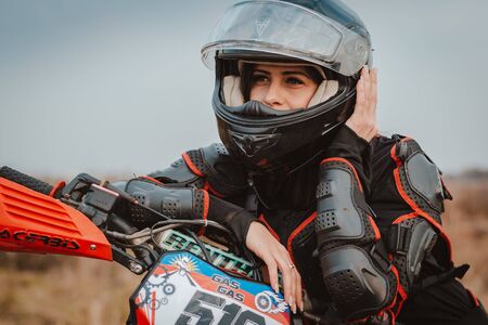 Beautiful brunette woman in motorcycle outfit. Female motocross racer next to her motorcycle. Russia Moscow 20 October 2019