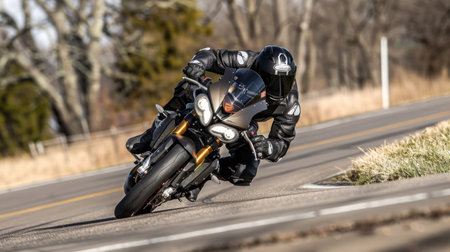 A motorcyclist in black protective gear expertly cornering on a country road with trees in the background.