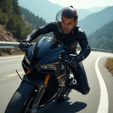 motorcyclist riding on a country road in a black jacket