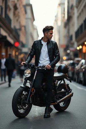 Attractive young man in a black leather jacket is sitting on a motorcycle on a city street.
