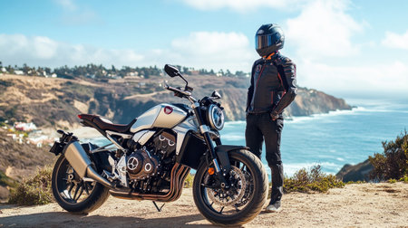 Biker is taking a break from riding to enjoy a beautiful ocean view