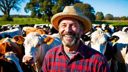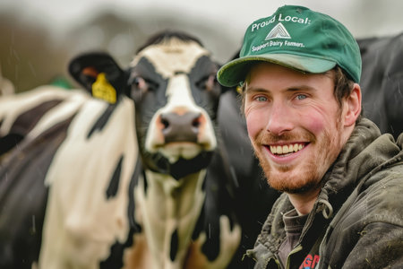 A jovial dairy farmer proudly stands with a friendly cow, promoting the vitality of local farming. The image exudes warmth and community spirit, highlighting the importance of sustainable agriculture